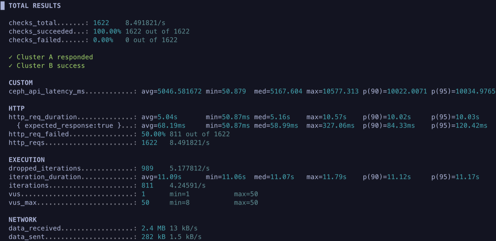 k6로 부하 테스트를 구성해서 두 가지를 비교했습니다. (Ceph 클러스터 장애 상황 기준)