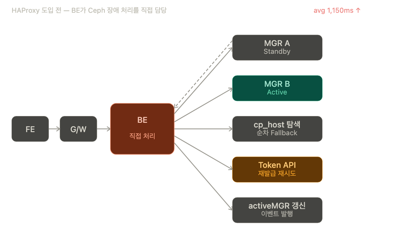 그래서 BE가 더이상 MGR 선택과 장애 판단을 직접 하지 않도록, Ceph Cluster 앞에 Reverse Proxy를 두고 BE는 항상 단일 진입점(VIP)만 호출하는 구조로 바꿨습니다.