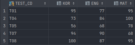 즉, 기준 테이블(TB_GRADE_08)과 대상 테이블(TB_GRADE_09)에서 TEST_CD 필드의 값이 매칭되는 'T01', 'T04', 'T07'을 검색