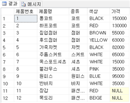 WHERE 종류 NOT IN ('점퍼','셔츠')